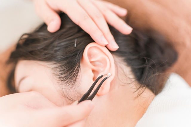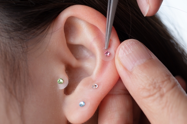 耳つぼジュエリーは、耳のツボに小さな粒を貼り、おしゃれを楽しみながら心身のケアを意識する人に使われるアイテムです。